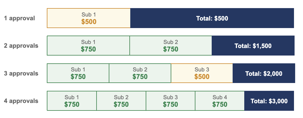 💡 The rule: every 2 approvals = both earn $750. One alone = $500. It always pays to keep submitting.